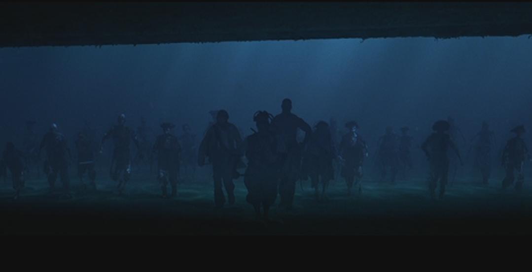 해군들과 전투를 벌이기 위해 해적들이 바다 밑을 걸어 가는 장면은
