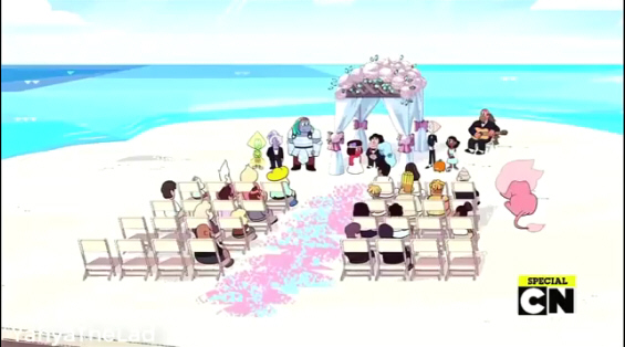 The wedding of Ruby and Sapphire, with the Gems and several Beach City citizens in attendance, goes without a hitch and Garnet reforms.
