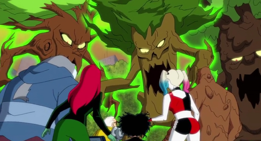 Scarecrow starts crop-usting fear toxin around Gotham's perimeters to force thousands of civilians towards the park with the murderous trees. As Batman tracks him down, the Justice League arrives to stop the trees. They assume Harley's crew is behind the attacks and attempt to send them to the Phantom Zone, but Ivy uses Wonder Woman's lasso to prove them wrong. Suddenly, the Queen of Fables traps the League in her fairy tale book before using a beanstalk to send Harley and her crew to be attacked by a giant cyclops. With Kite Man's help, they are able to return to the ground safely. Just then, Joker appears with a large tower and destroys the Hall of Doom as he enacts his plans to take over Gotham City and orders the Queen to kill Harley and her team. Ivy uses the contaminated water to grow into a giant to fight the trees while Harley defeats the Queen, beheading her in the process. Just as Harley makes amends with Ivy, Joker shoots a giant flagpole through Ivy's chest.